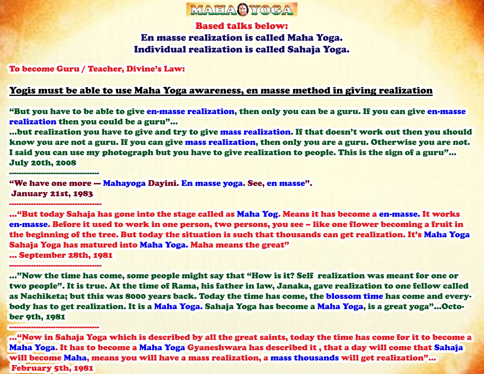 Divine Laws for Gurus (teachers)- Must be able to use Maha Yoga awareness, en masse method in giving realization